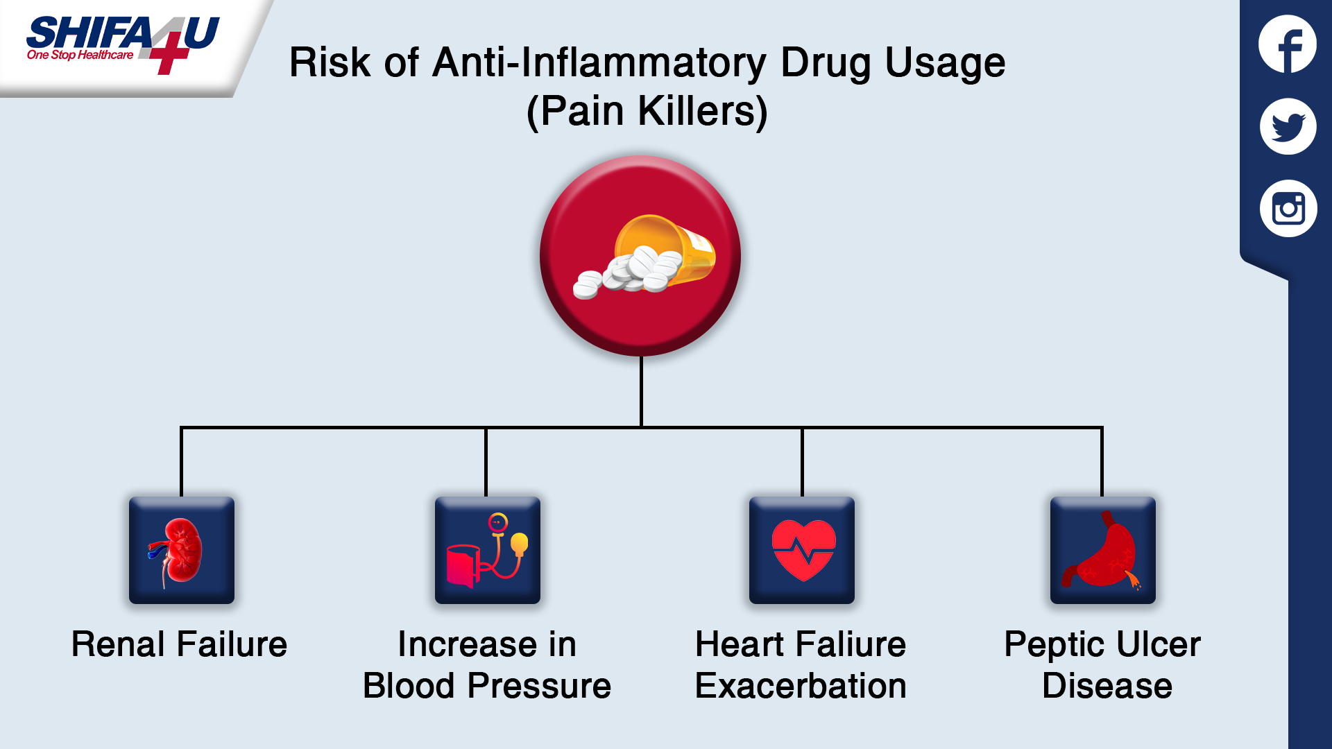 Risks of Anti-Inflammatory Drug usage (NSAIDs commonly known as pain killers) in long term and even short term are very high regarding their association with kidney injury, increase in blood pressure, Heart failure exacerbation (in patients with history of Heart disease) and peptic ulcer disease. In USA & Pakistan they are used heavily and self-prescribed for pain and commonly known as magic drug (Dard ki dawa) for every pain.